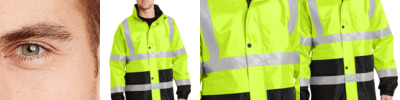 100% polyester woven 300-denier oxford shell with durable water-repellent (DWR) finish 5.2-ounce, 100% polyfill insulation, box diamond quilted body and sleeve lining Black bottom front and lower sleeves for a cleaner appearance Fabric waterproof rating: 5000MM Fully seam-sealed Adjustable, zip-removable rain hood with hook and loop closure and toggles Durable, reflective 2-inch tape meets ANSI 107 requirements and provides 360-degree visibility Full-length exterior storm flap Left chest bellows pocket Two open lower front pockets Molded center front zippered closure Elastic cuffs Elastic hem Decoration access pocket This garment must be fully zipped to be in compliance with ANSI 107 standards