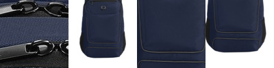 840D poly two-tone PU Spacious main compartment with organization panel Easy-access padded laptop/compartment with fleece-lined, brushed tricot tablet sleeve Interior organization pockets Dual side mesh beverage pockets Ergonomic adjustable air mesh shoulder straps Reflective piping on front, handle and shoulder straps for increased visibility Integrated webbing luggage trolley strap on back Dimensions: 19'h x 10.5'w (top) x 13.5'w (bottom) x 9.5'd Capacity: 1,464 cu. in./24 L Weight: 1 lb./1.2 kgs Laptop sleeve: 15'h x 11'w; fits most 17' laptops Note: Bags not intended for use by children 12 and under.