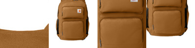 1200D heavy-duty polyester Rain Defender ® durable water repellent (DWR) Large main compartment with dedicated tablet sleeve Top compartment with dedicated pocket for power pack and cord port Front zippered organization 2 exterior mesh pockets Padded compartment with dedicated 15-inch laptop sleeve Contour-fit shoulder straps with FastDry ® sweat-wicking technology Padded air mesh back panel with a webbing strap that can fit over dual trolley handle of wheeled bag Carhartt label sewn on front top pocket Duravax abrasion-resistant base Capacity: 28L Dimensions: 18'h x 12'w x 10'l; Approx. 1,709 cubic inches Note: Bags not intended for use by children 12 and under